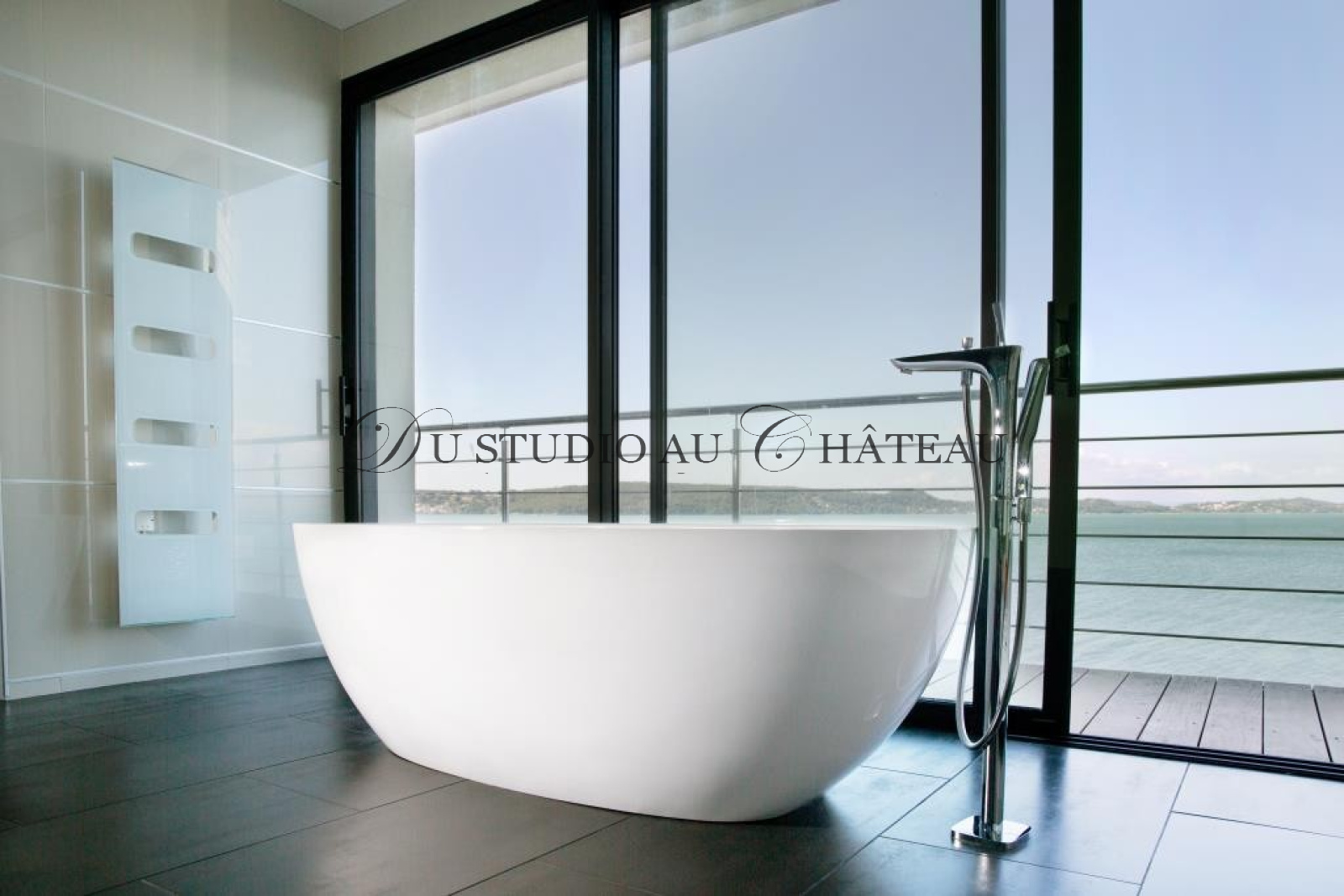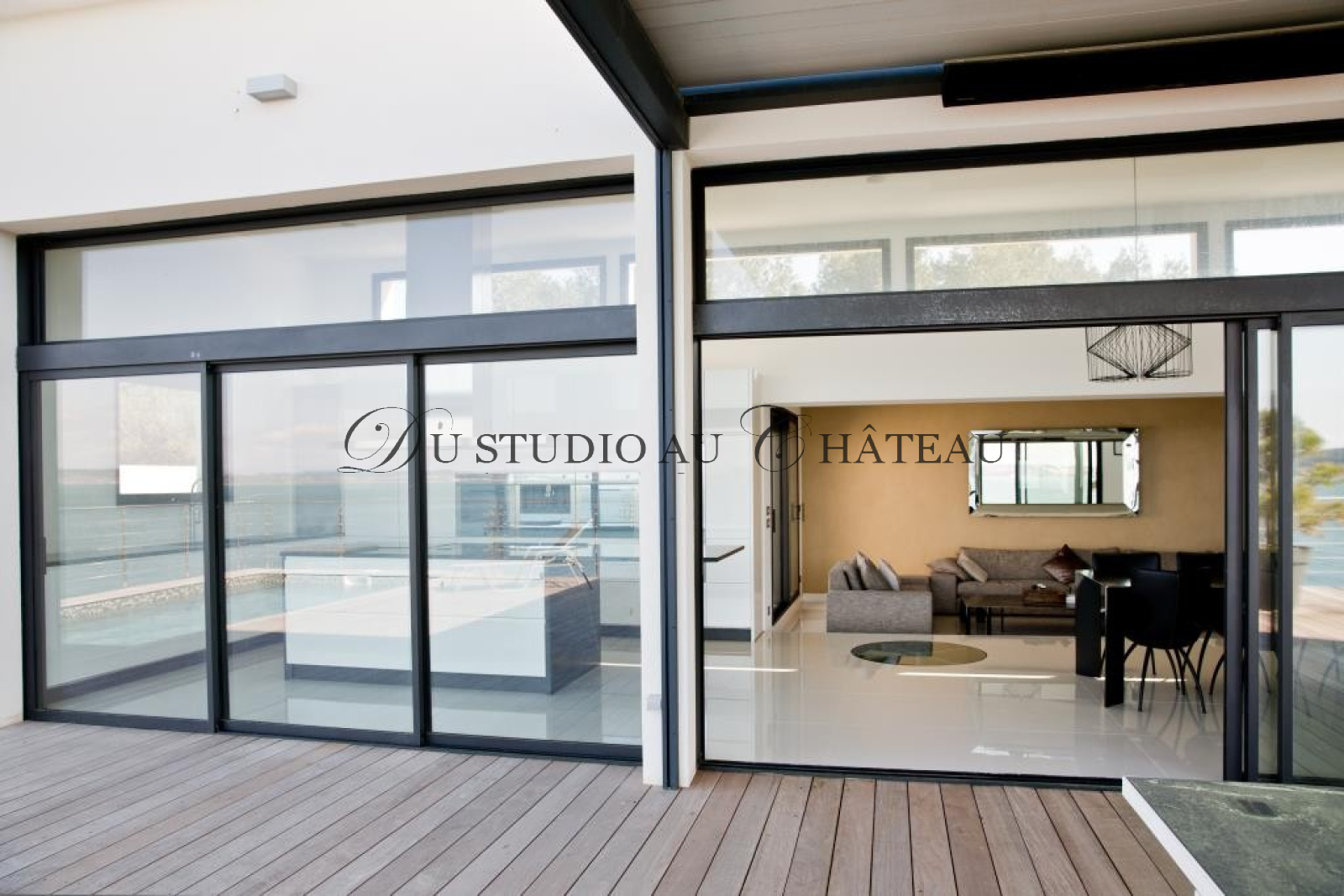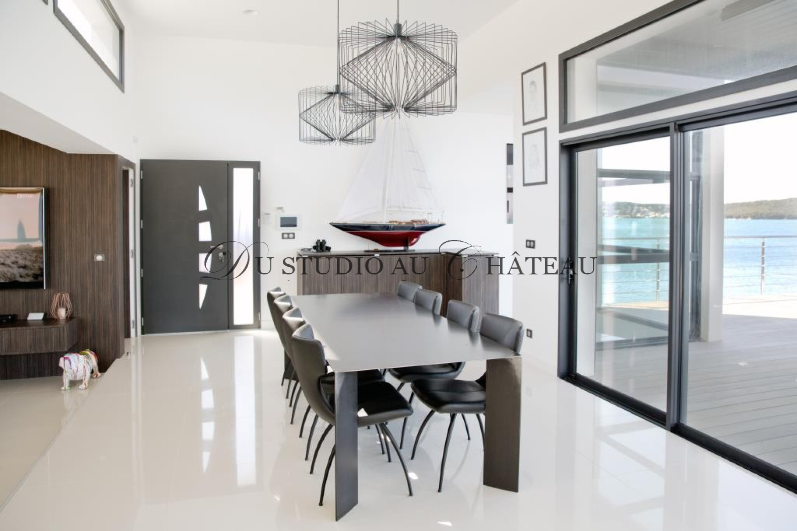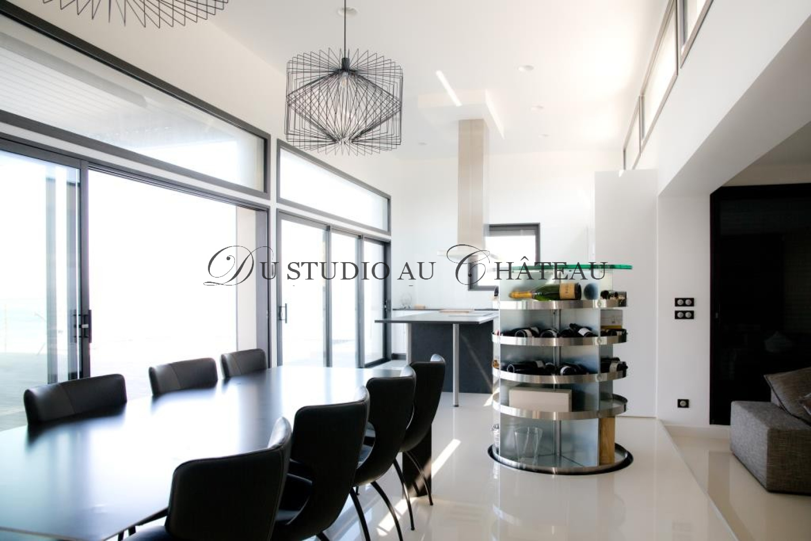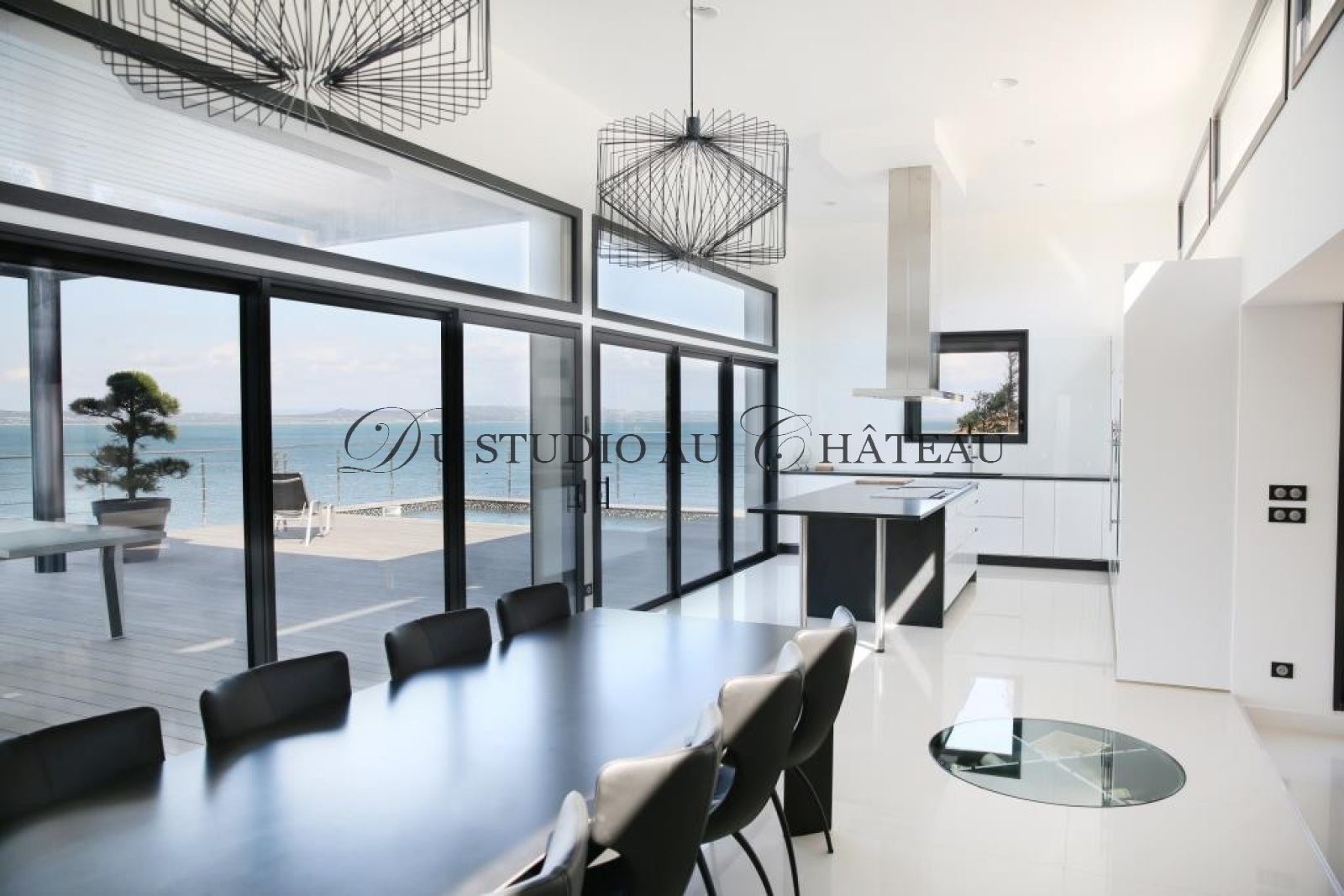 Au grand calme, les pieds dans l'eau, vue panoramique, propriété exceptionnelle très contemporaine et sans vis-à-vis. Immense salon/ salle à manger, cuisine équipée, véranda bio climatique, cave à vin, chauffage au sol et rafraichissant, absolument unique !