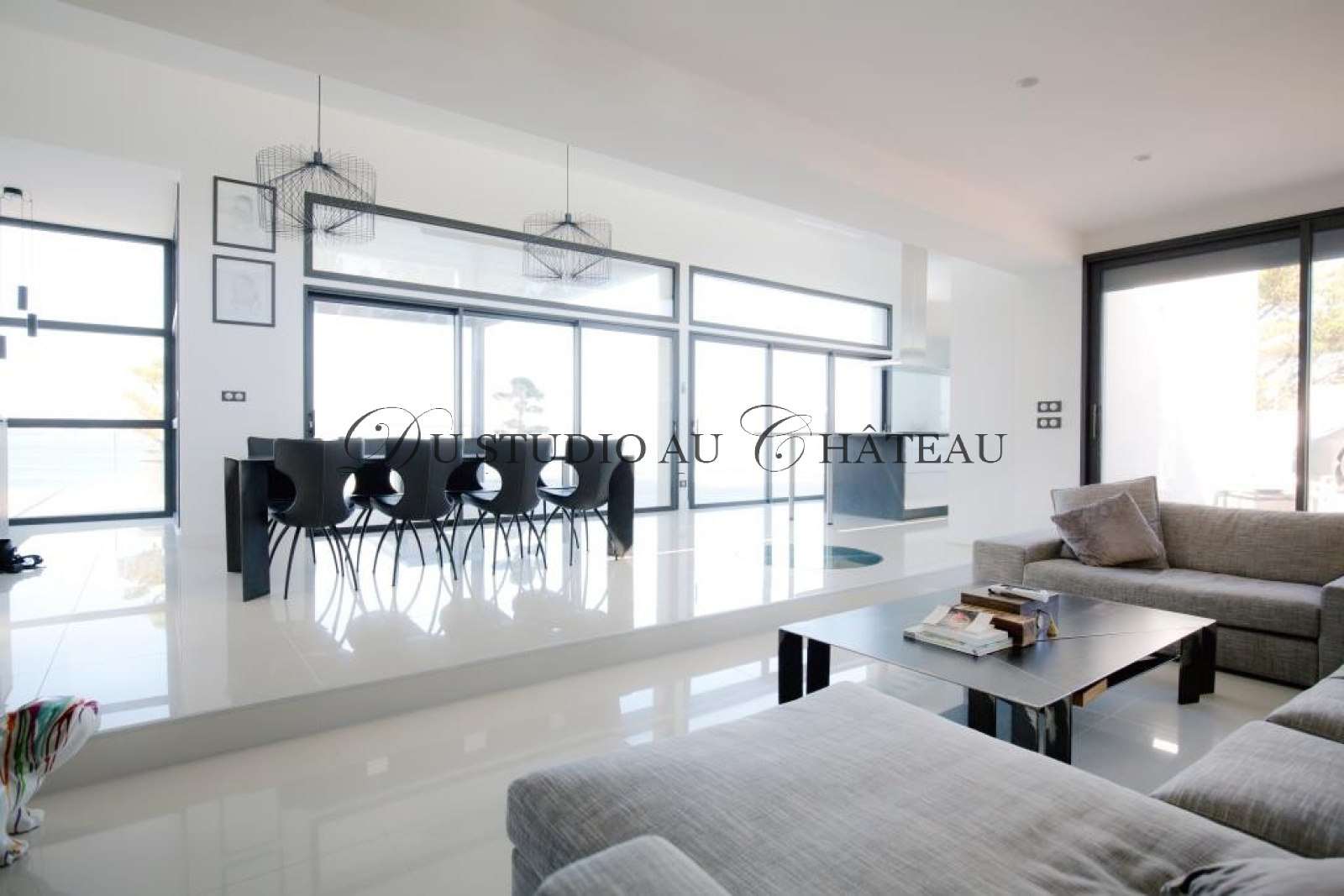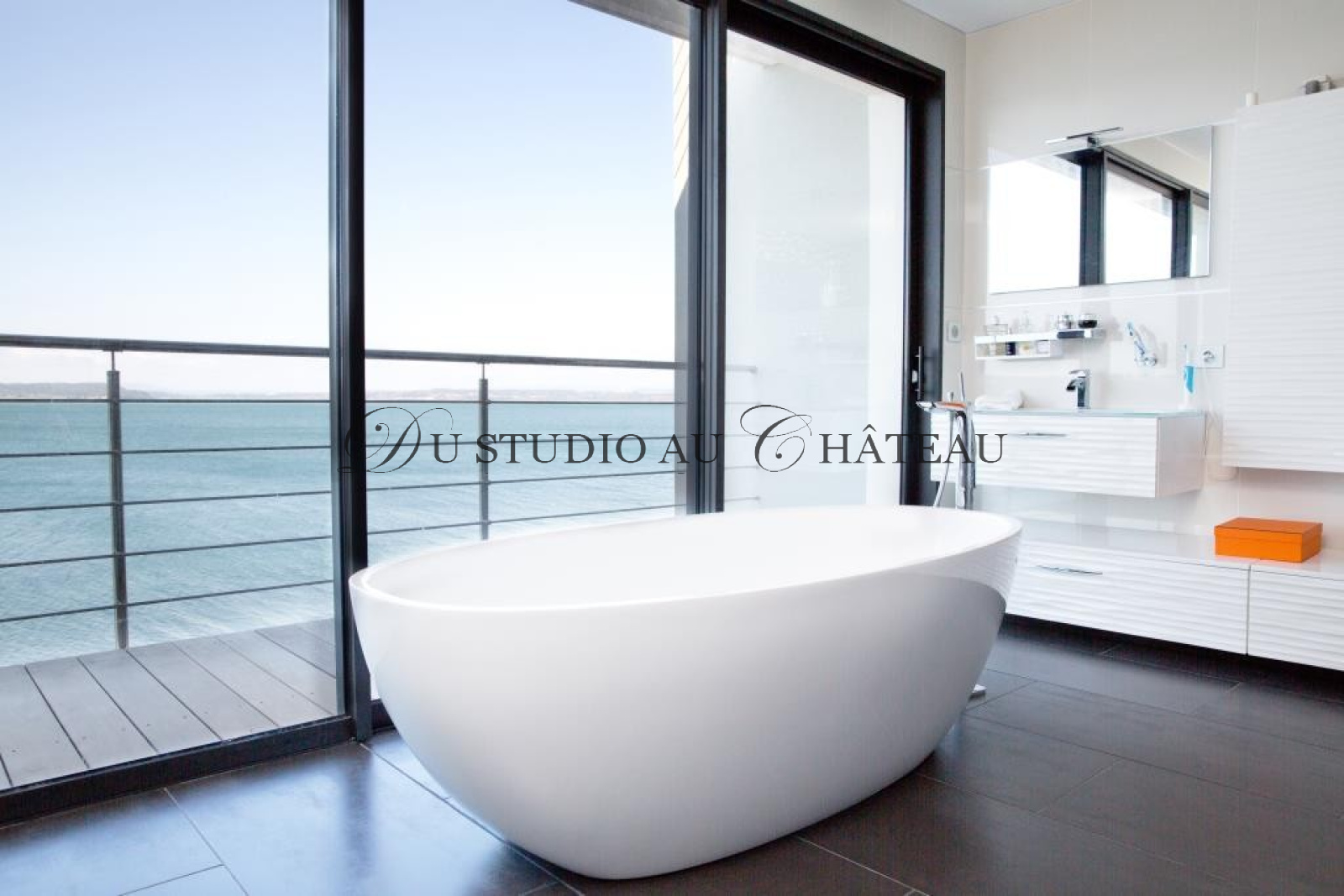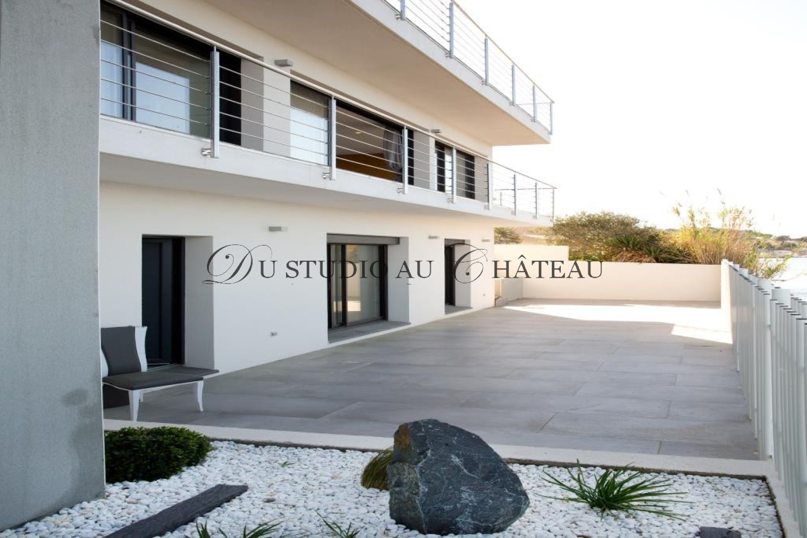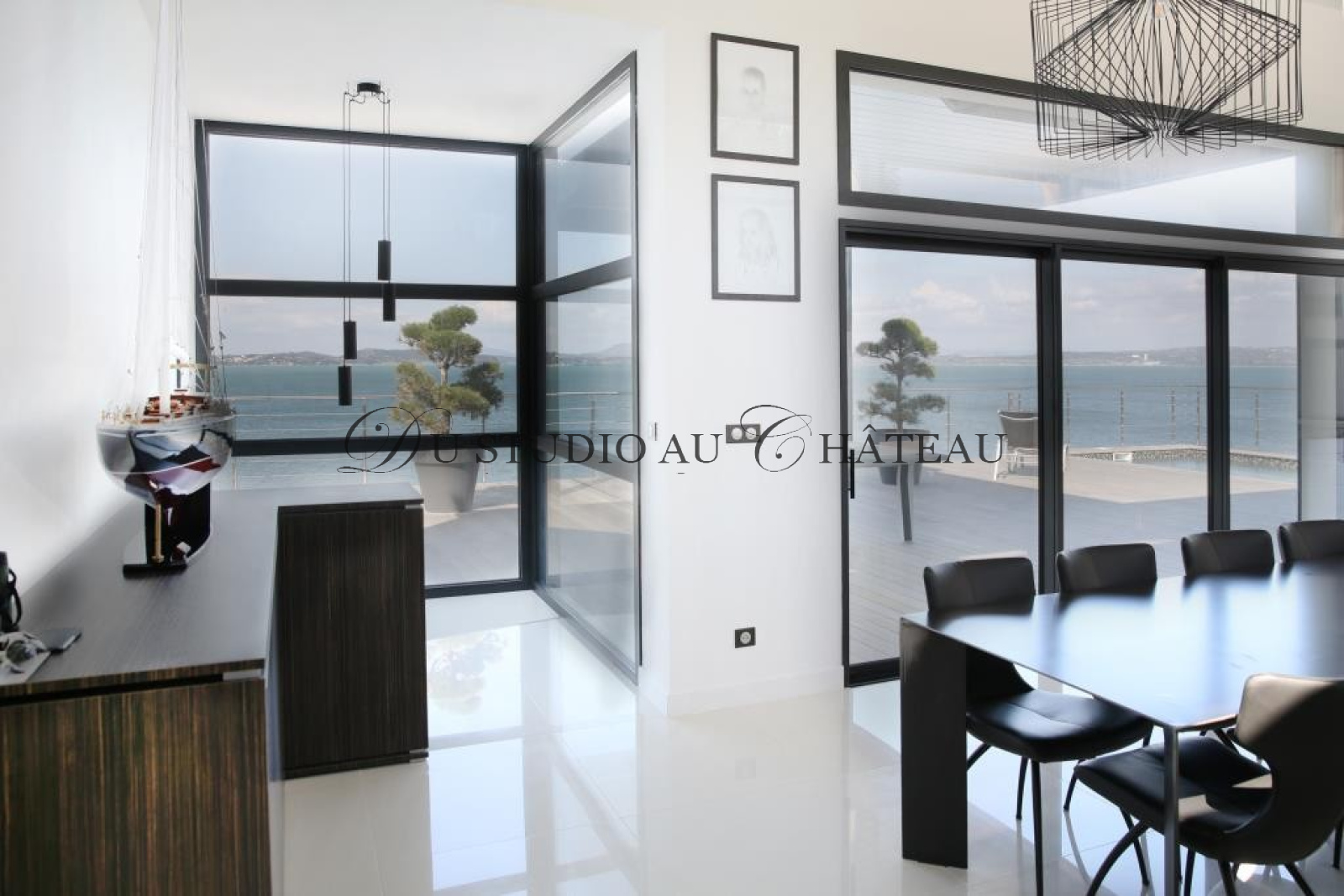 Au grand calme, les pieds dans l'eau, vue panoramique, propriété exceptionnelle très contemporaine et sans vis-à-vis. Immense salon/ salle à manger, cuisine équipée, véranda bio climatique, cave à vin, chauffage au sol et rafraichissant, absolument unique !